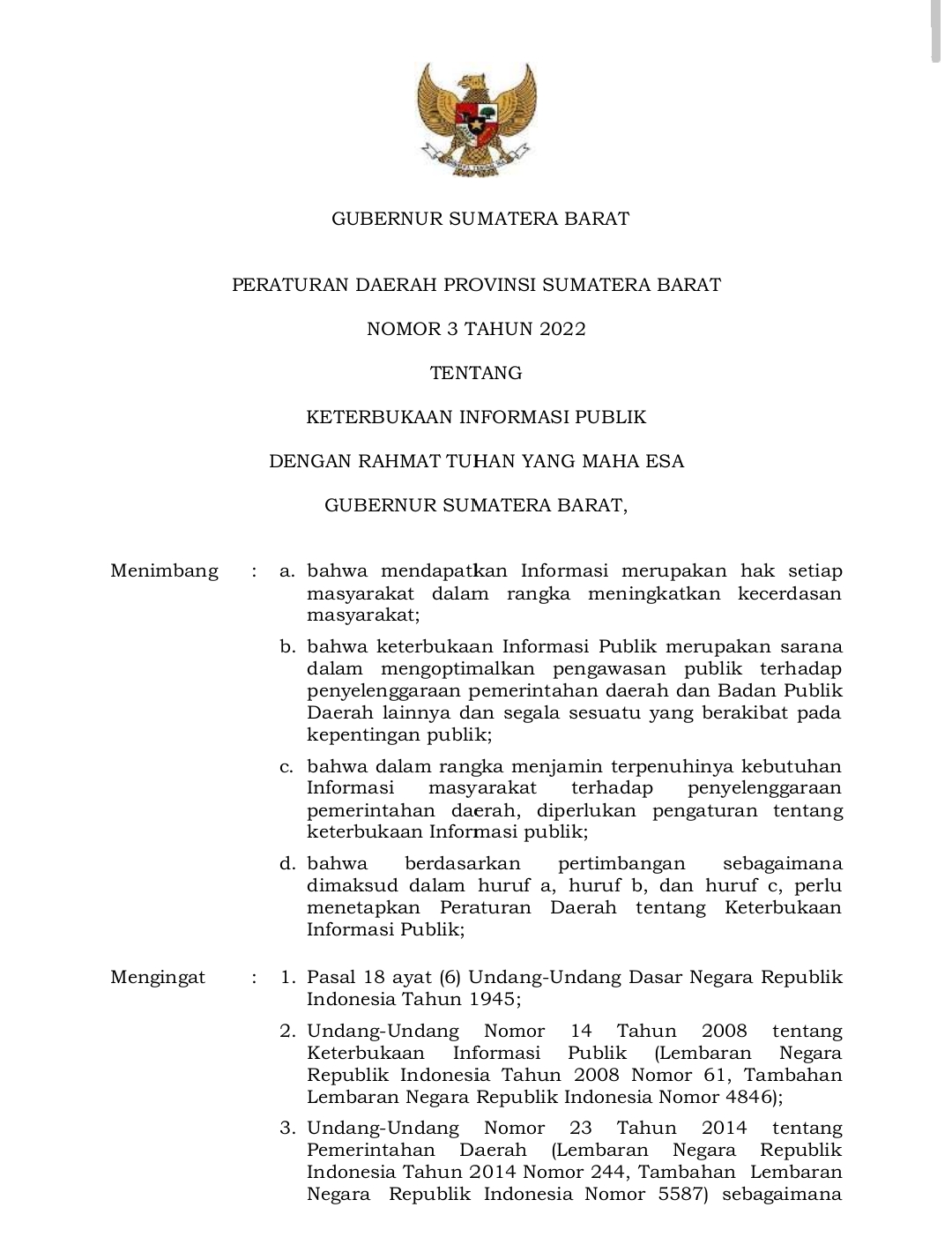 Peraturan Daerah Provinsi Sumatera Barat Nomor 3 Tahun 2022 Tentang Keterbukaan Informasi Publik Undu...